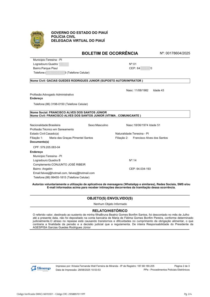 Já tem orientações aos afetados de fazer BO denunciando o presidente da Agespisa GARCIAS GUEDES de reter as pensões alimentícias. Segundo o Presidente do SENGE-PI, além também de não fazer o repasse das mensalidades dos sindicatos e associações descontadas nos contra cheques já entrando no terceiro mês. O SENGE-PI deverá denunciar por apropriação indébita dos recursos das entidades.