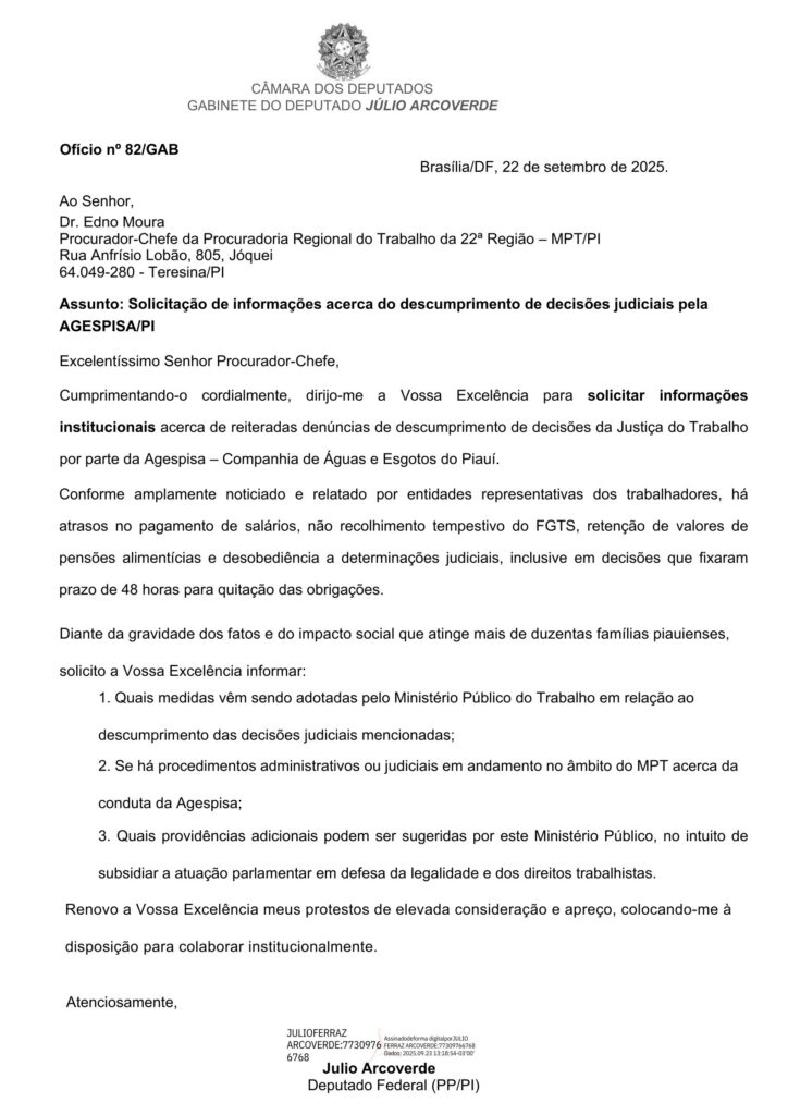 Em destaque o ofício encaminhado pelo Deputado Júlio Arcoverde ao Procurador-Chefe da Procuradoria Regional do Trabalho da 22ª Região – MPT/PI