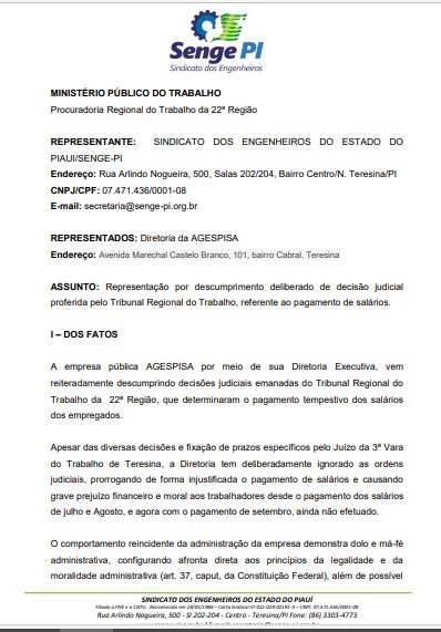 O Sindicato dos Engenheiros do Estado do Piauí (SENGE-PI) protocolou, nesta quarta-feira, uma denúncia no Ministério Público do Trabalho (MPT) contra a diretoria da Agespisa, em razão do reiterado descumprimento de decisões judiciais proferidas pela 3ª Vara da Justiça do Trabalho de Teresina.