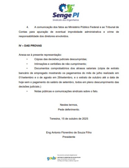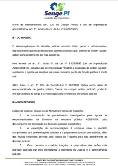 Na denúncia, o SENGE-PI solicita que o MPT investigue possíveis crimes de responsabilidade e represente a diretoria da empresa junto ao Ministério Público Federal (MPF), diante do que o sindicato classifica como um “deboche institucional” com as determinações judiciais.