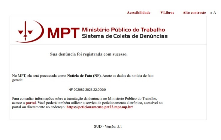 Segue protocolo da denúncia feita no Ministério Público do Trabalho
