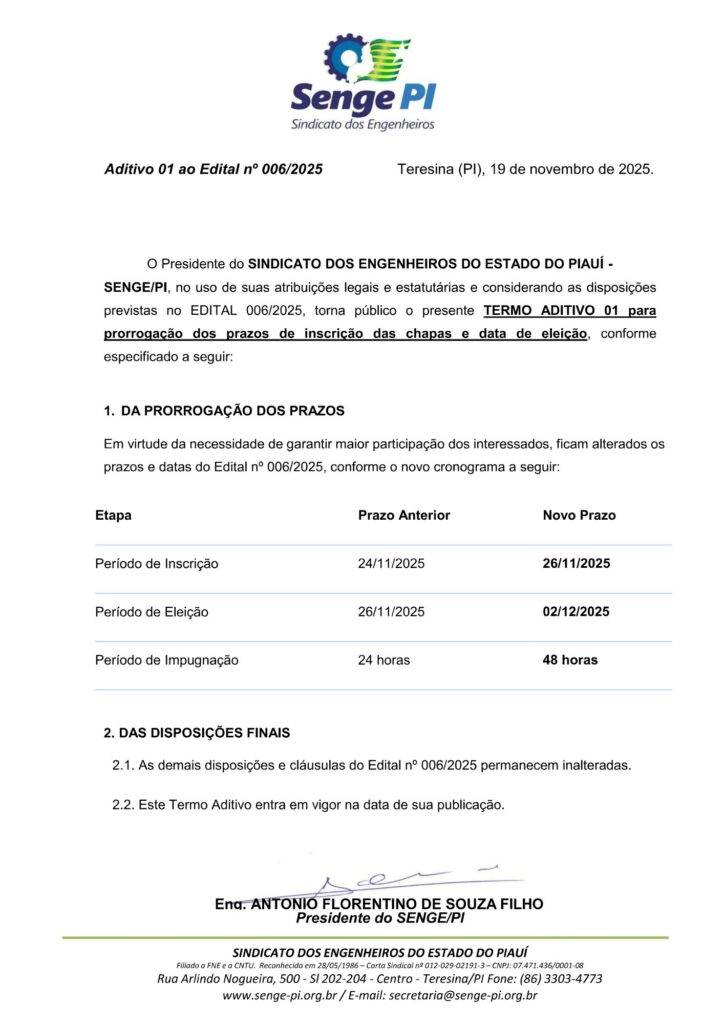 O Presidente do SINDICATO DOS ENGENHEIROS DO ESTADO DO PIAUÍ – SENGE/PI, no uso de suas atribuições legais e estatutárias e considerando as disposições previstas no EDITAL 006/2025, torna público o presente TERMO ADITIVO 01 para prorrogação dos prazos de inscrição das chapas e data de eleição, conforme especificado a seguir: